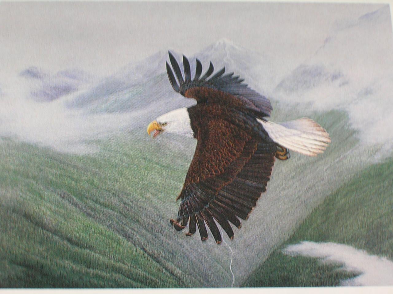 Majestic Flight. One of his earlier prints, this beautiful bald eagle soars high above the Cascade Mountains of Washington State. Add this American icon to your collection.