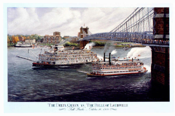 Tall Stacks. This print portrays the famous Ohio River race between the Delta Queen and the Belle of Louisville.